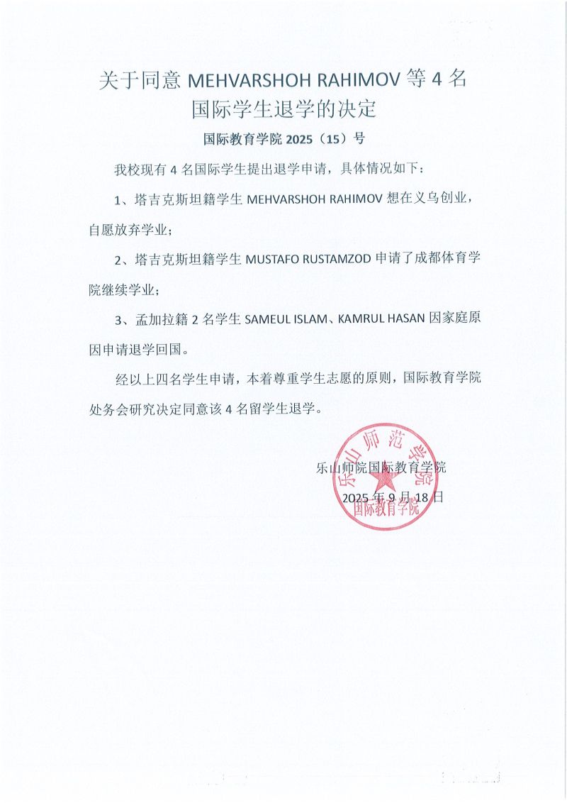 关于同意MEHVARSHOH RAHIMOV等4名国际学生退学的决定