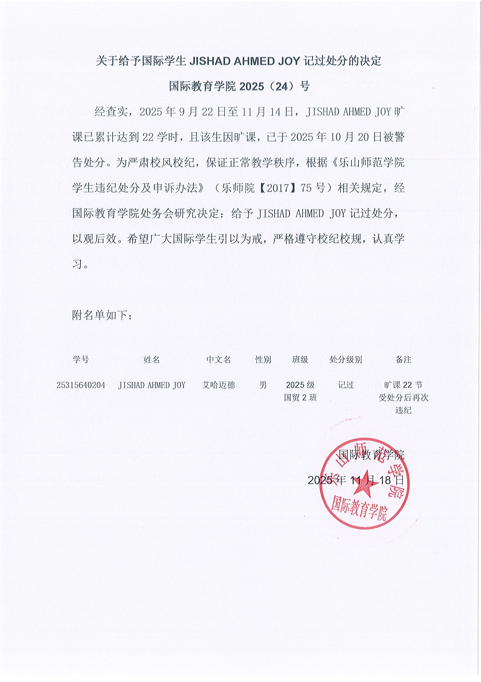 经查实,2025年9月22日至11月14日,JISHAD AHMED JOY旷课已累计达到22学时,且该生因旷课,已于2025年10月20日被警告处分。为严肃校风校纪,保证正常教学秩序,根据《乐山师范学院学生违纪处分及申诉办法》(乐师院【2017】75号)相关规定,经国际教育学院处务会研究决定:给予JISHAD AHMED JOY记过处分,以观后效。希望广大国际学生引以为戒,严格遵守校纪校规,认真学习。