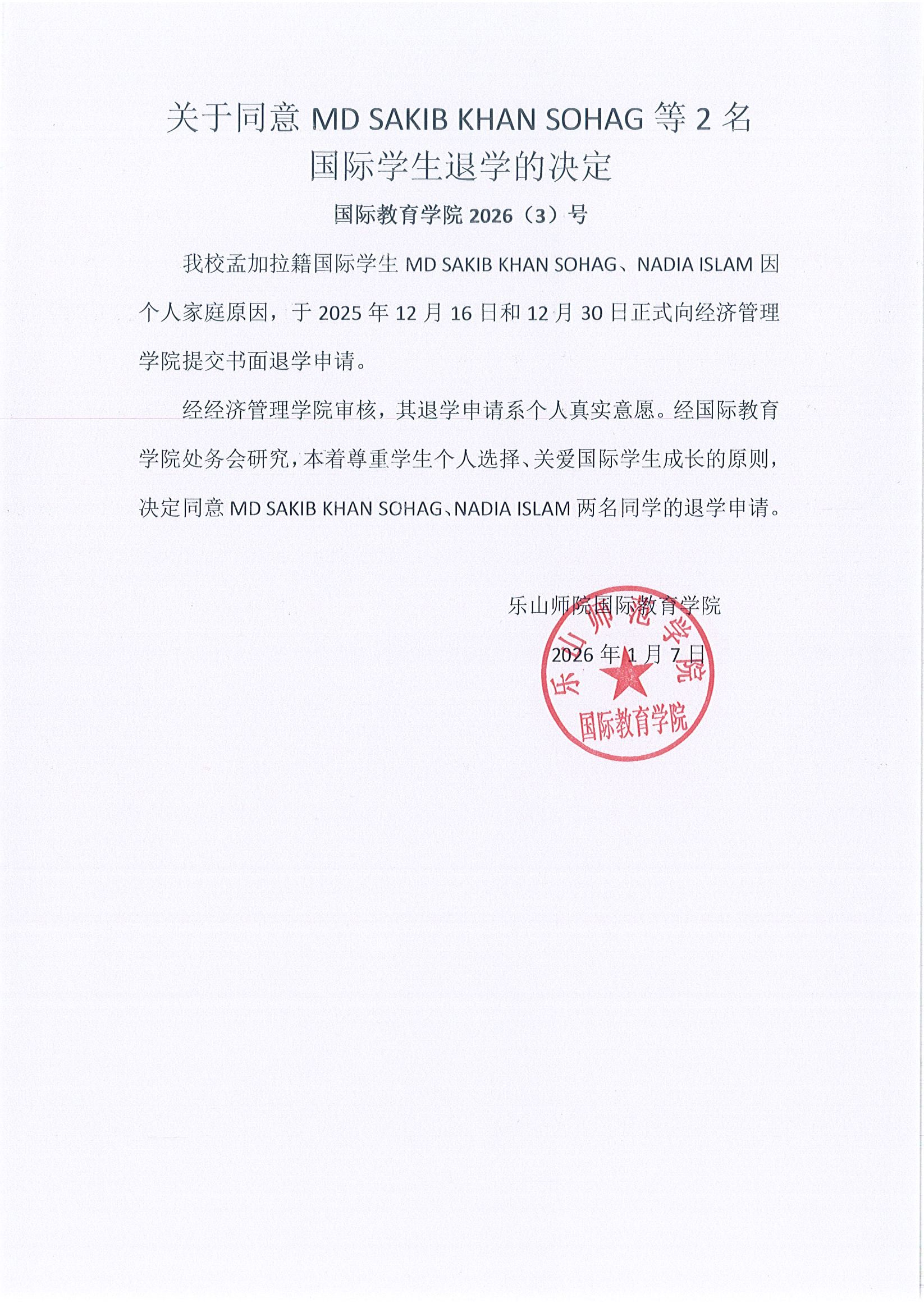 我校孟加拉籍国际学生MD SAKIB KHAN SOHAG、NADIA ISLAM因个人家庭原因,于2025年12月16日和12月30日正式向经济管理学院提交书面退学申请。