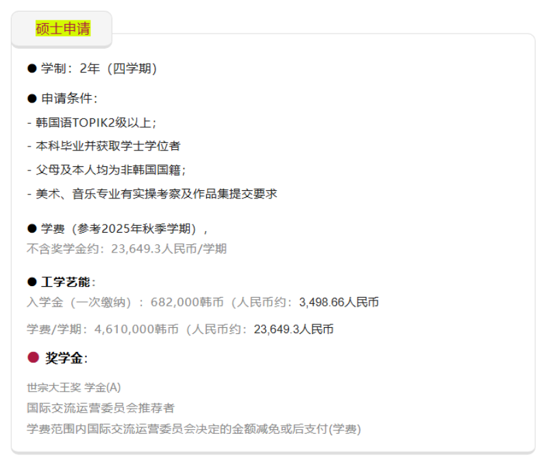 费用相关总计:2.98万元/学期含:一学期学费、韩语零基础~2级语言课程费(保级、签证费、住宿费)